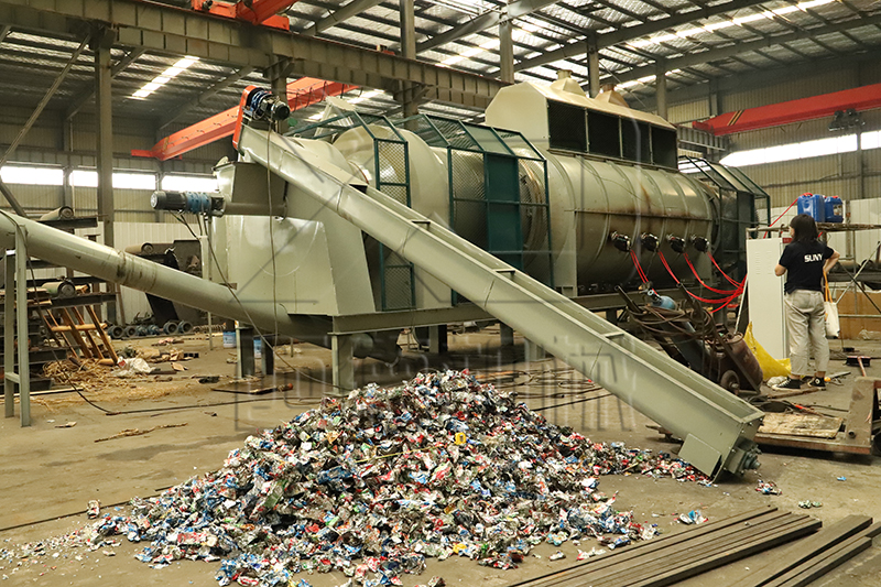 工藝原理 打包壓塊或壓扁的易拉罐先經(jīng)過(guò)撕碎機(jī)加工成4cm左右的碎片,經(jīng)過(guò)螺旋加料機(jī)加入到連續(xù)式炭化爐滾筒內(nèi),因?yàn)闋t內(nèi)幾乎是密閉空間,滿足了厭氧的條件,使易拉罐在炭化爐內(nèi)部400度以上的溫度進(jìn)行熱解和炭化,產(chǎn)生的煙氣通過(guò)回收管道、煙氣凈化系統(tǒng),再到燃燒器燃燒對(duì)主爐進(jìn)行加熱,達(dá)到往復(fù)循環(huán)加熱炭化的效果。初次炭化預(yù)加熱時(shí),易拉罐表層漆開(kāi)始炭化熱解,熱解出可燃?xì)怏w達(dá)到能正常燃燒,氣體循環(huán)燃燒并且沒(méi)有煙氣外排的正常生產(chǎn)狀態(tài),最終得到純凈的鋁。